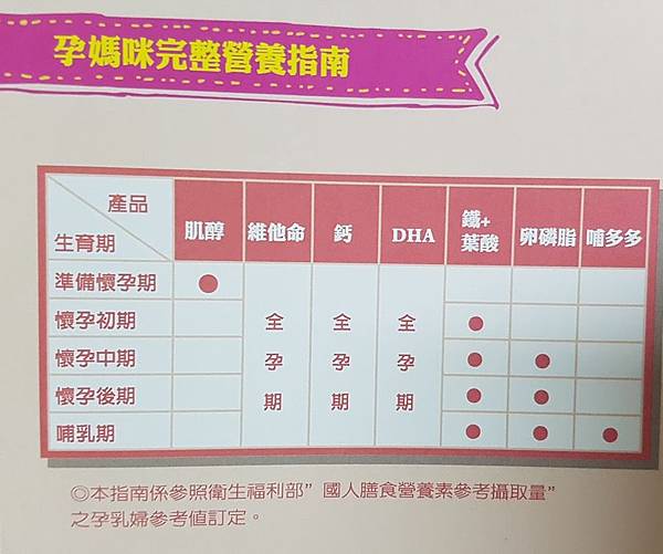 最後附上一張孕哺兒提供各個時期媽咪的營養指南建議