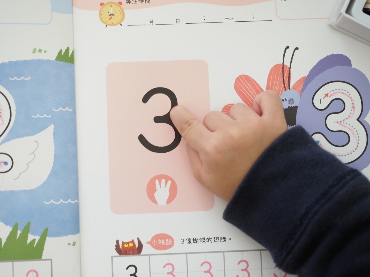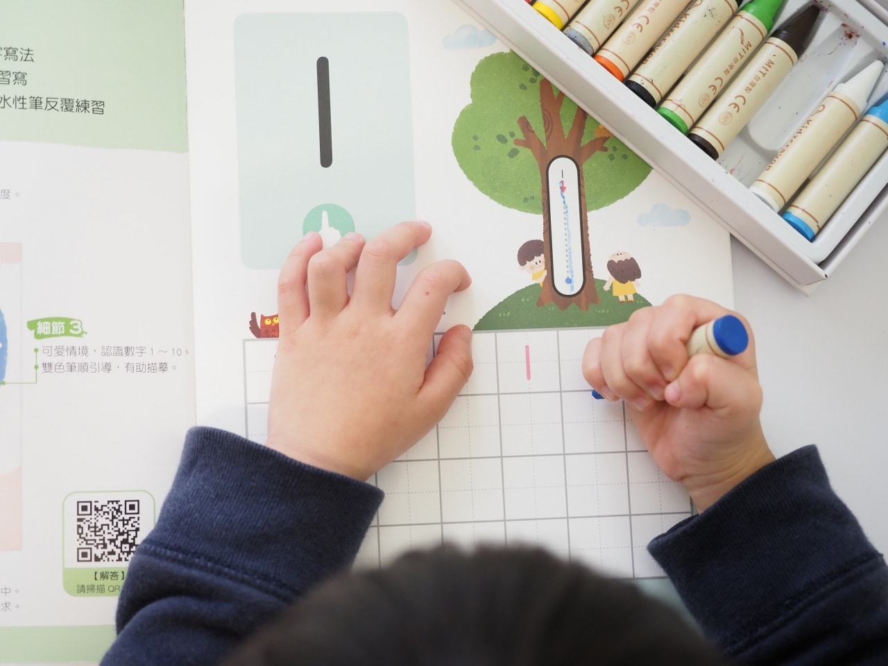 我們家也有陸續買過幾個出版社的練習本,小康軒的練習本是比較走『教育體制內』的練習本,符合教育部108課綱的教科書式內容和偏排。練習本的範本、規格、練習進度都是有規劃性的安排,也能幫助孩子提早適應小學課程。不過也因為這樣,他們的編排內容我覺得的比較偏中班、大班之後的孩子,公子目前小班我只有拿1~50這本讓他試著寫寫看,認識數字