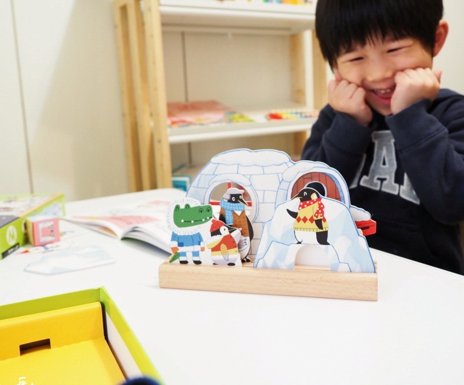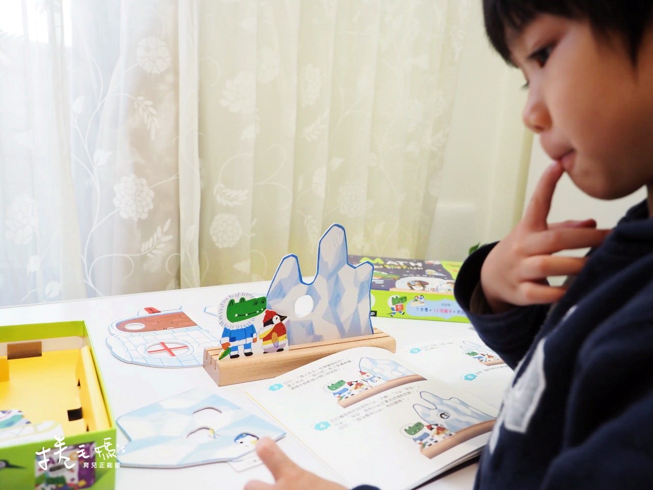 教具是書上的場景和人物圖卡,質感都做得非常好,木頭底座上設計了三條溝槽,跟著書上的故事走向,擺放出一樣的場景,就像是故事主角從書上走了出來。在擺放的同時需要運用到前後左右方向判斷的能力,很容易一玩安靜3小時的遊戲書XD