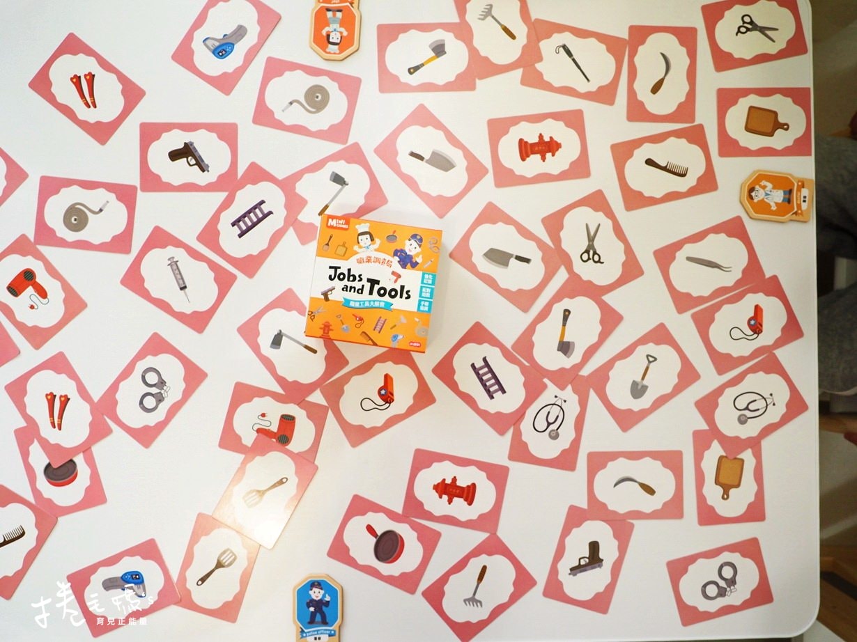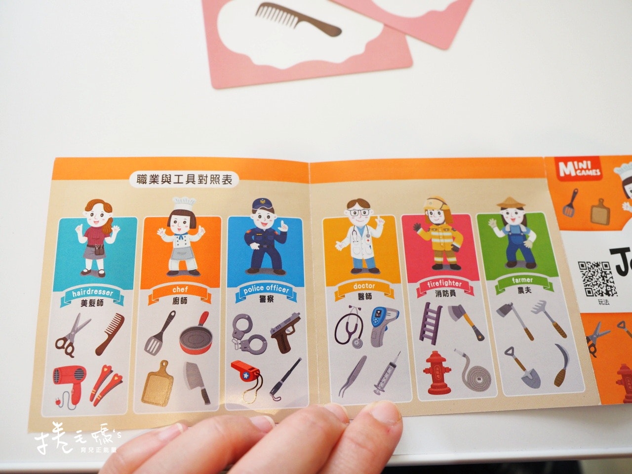 3歲以上的孩子對於職業已經算是很有概念了,這組設計的遊戲也很活潑。藉由小孩喜歡的角色扮演玩出3種玩法:1.眼明手快、2.職業猜一猜、3.記憶挑戰。就算只有一大一小也能玩得很開心。